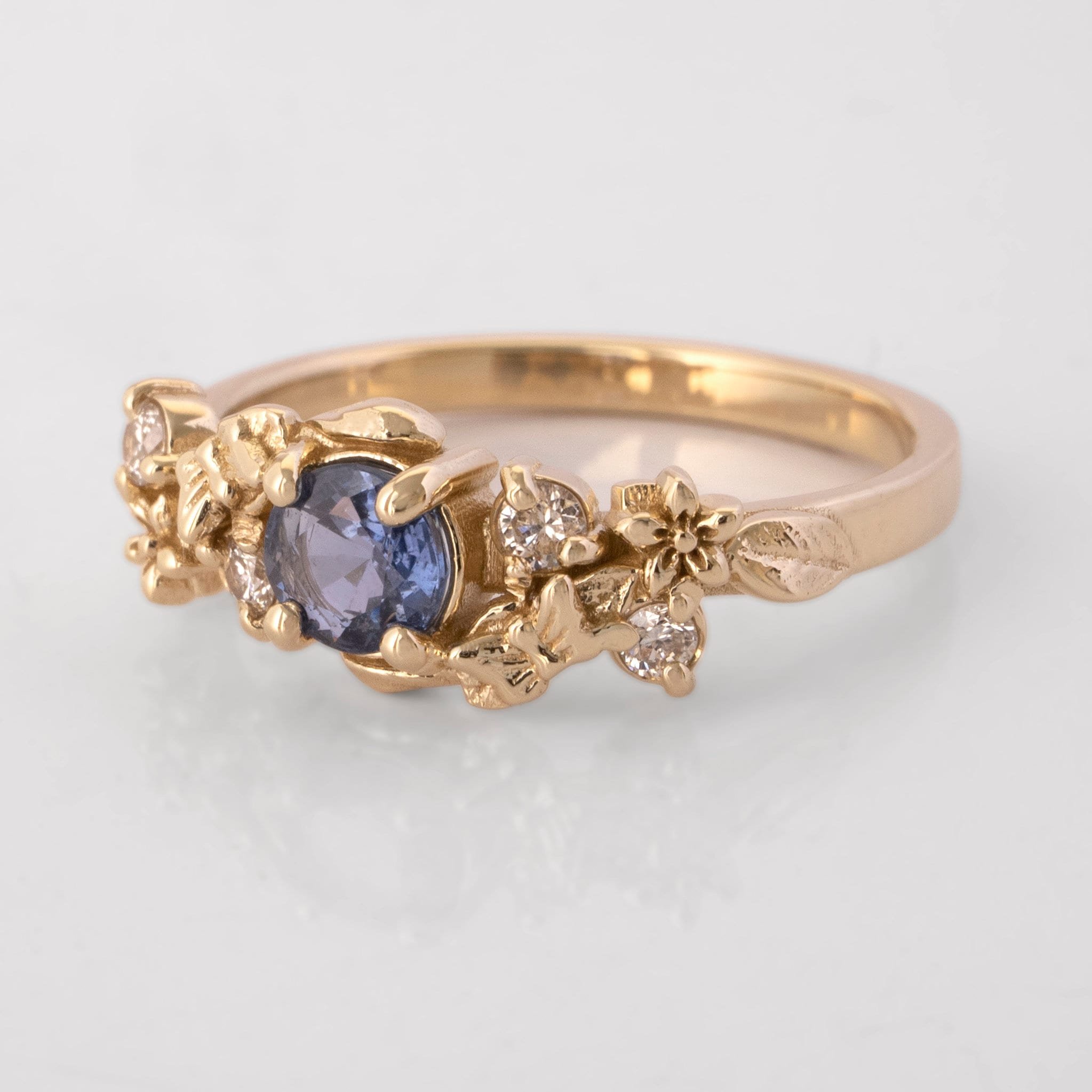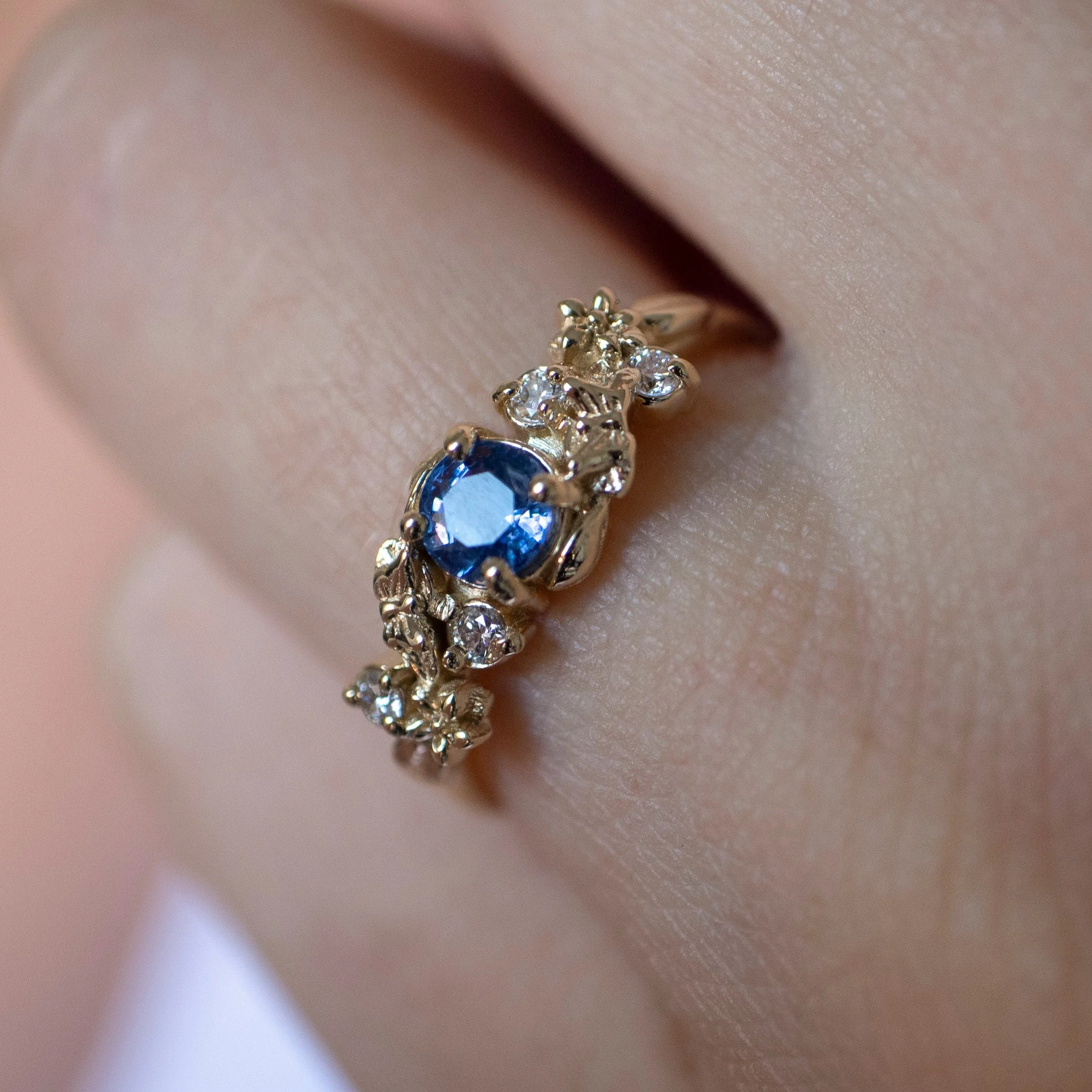 Custom Fairytale Blue Sapphire and diamond engagement ring, embellished with butterflies, flowers and leaves - a ring emulating a magical forest, just like the magic of your love.