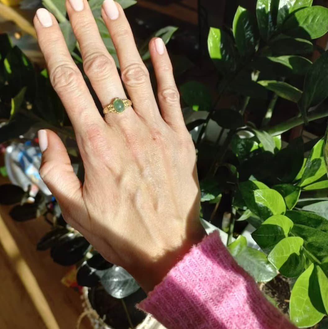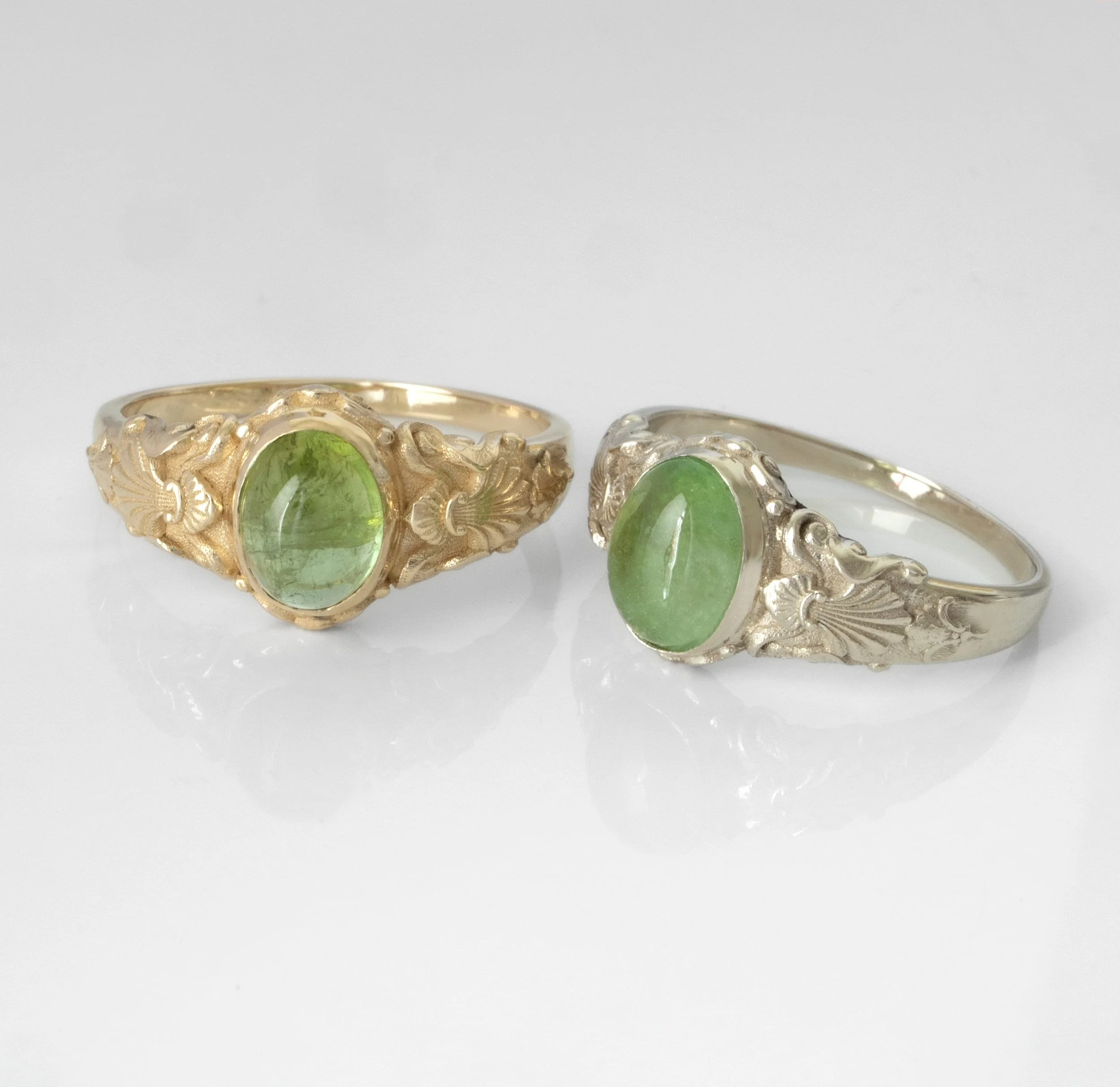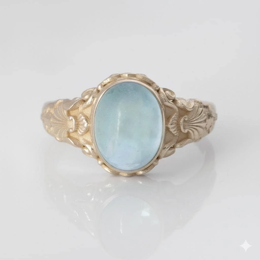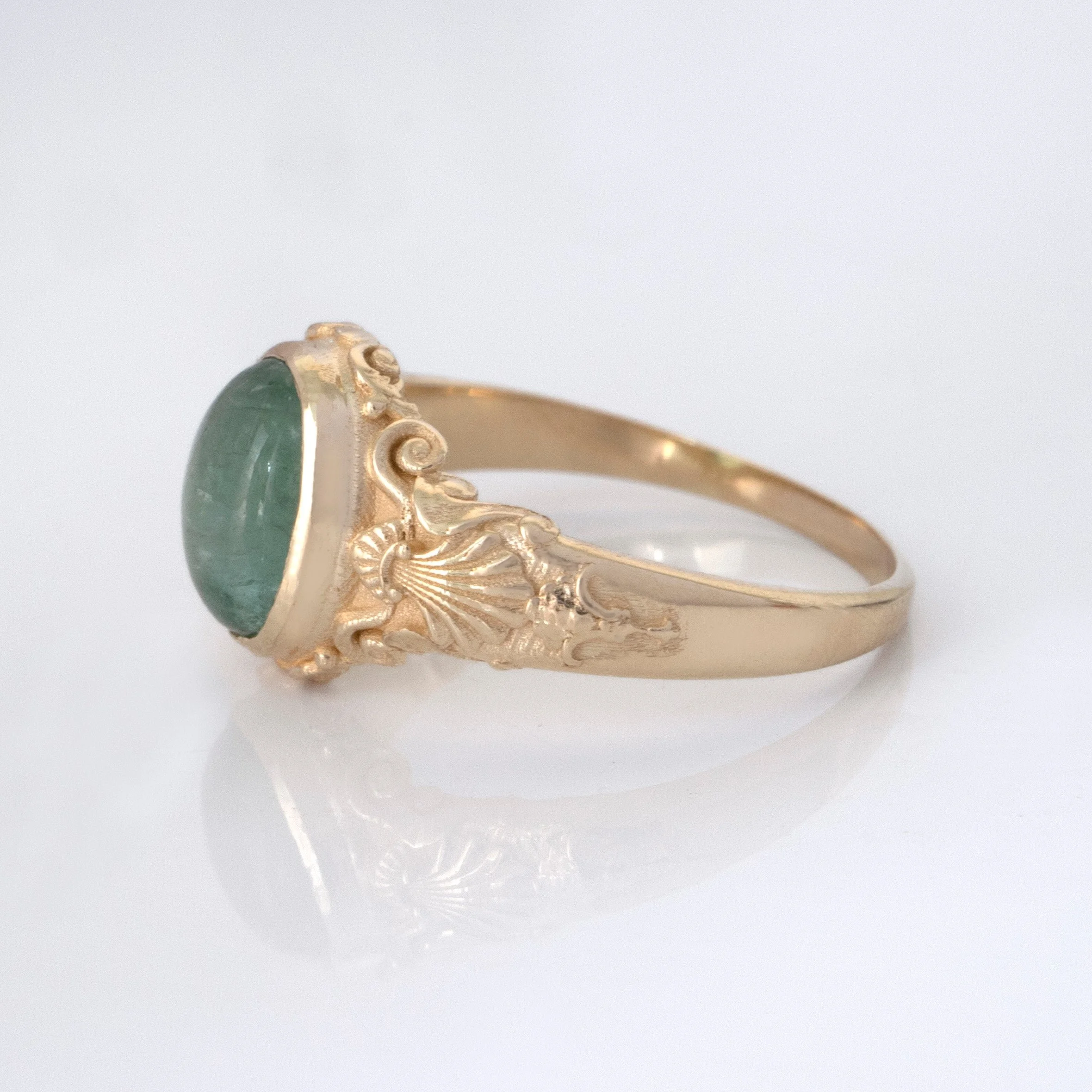 This vintage style sea-themed signet ring, featuring beautiful little shells and ocean-inspired fluorishes all around the center which displays a lovely Seafoam green tourmaline or aquamarine cabochon. You may also select from other available gemstones shown such as citrine and pink tourmaline.